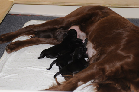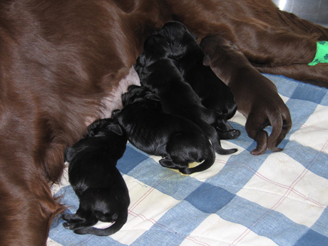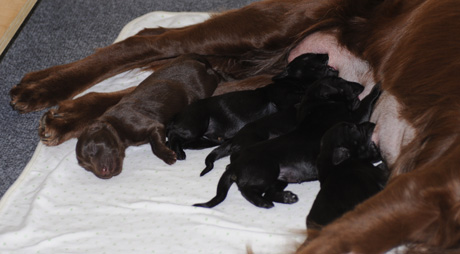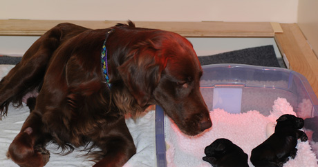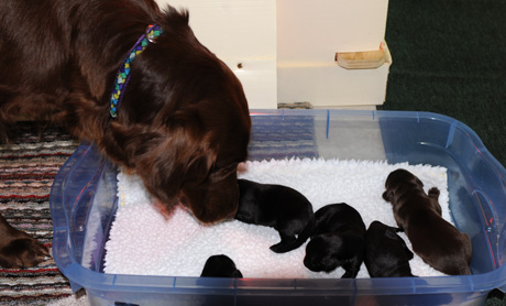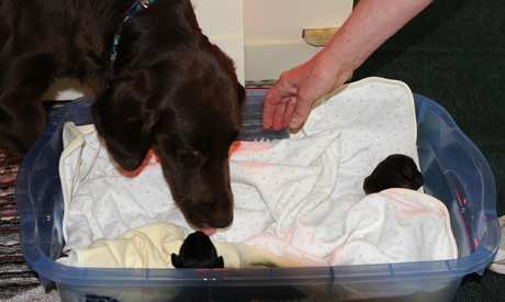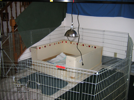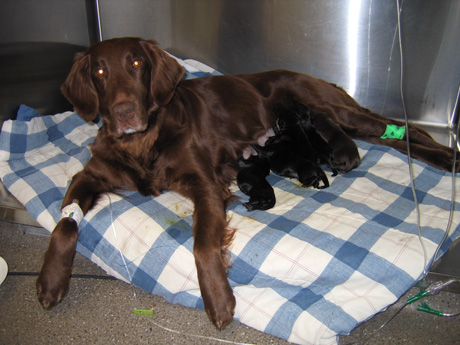 | Snicker's water broke at 9:00pm and she began heavier labor. We were not very comfortable with the way labor was progressing. Snicker's behavior didn't seem consistent with her labor behavior in 2005. Although she as having contractions and seemed uncomfortable, there was no progression toward having a puppy. At 11:15pm Snicker still hadn't whelped any pups, so off we went to the emergency vet. The x-ray they took there showed that there was possibly a puppy whose head had progressed past the birth canal. This meant that not only was that puppy "stuck", but so was everyone behind him/her. At that time the decision was made to deliver the pups by c-section. | |