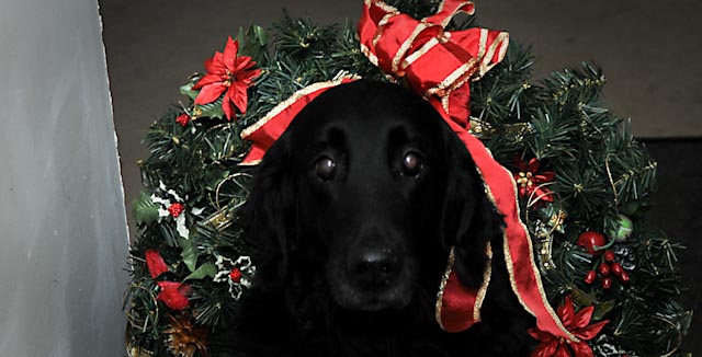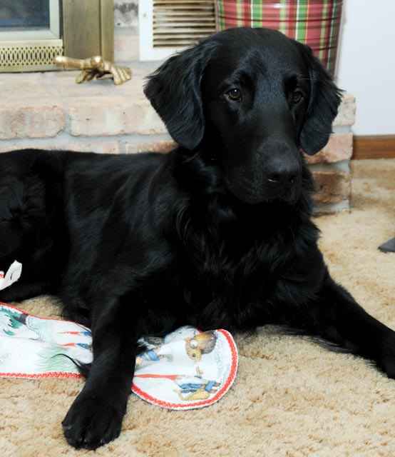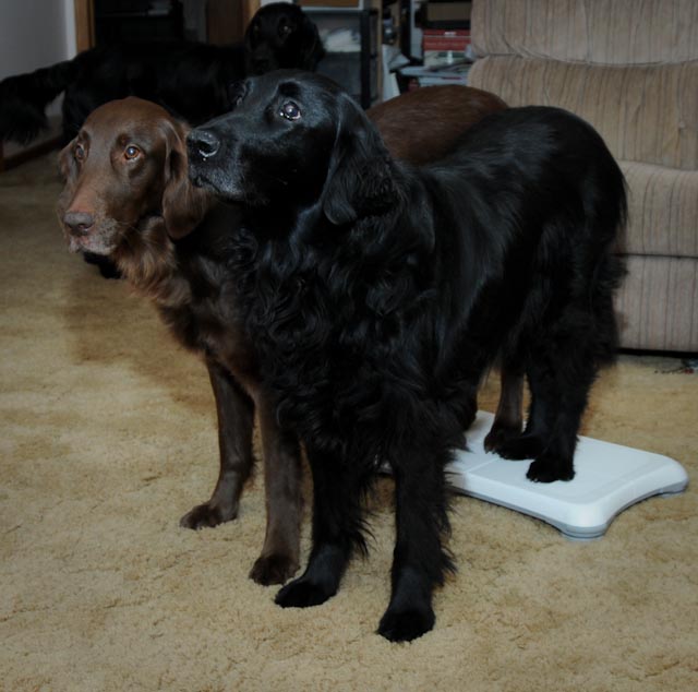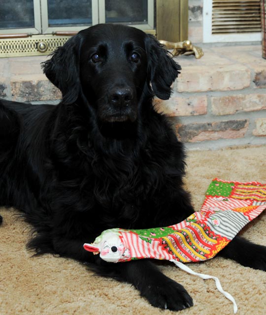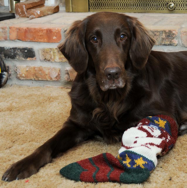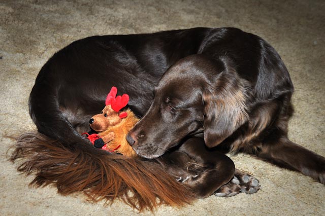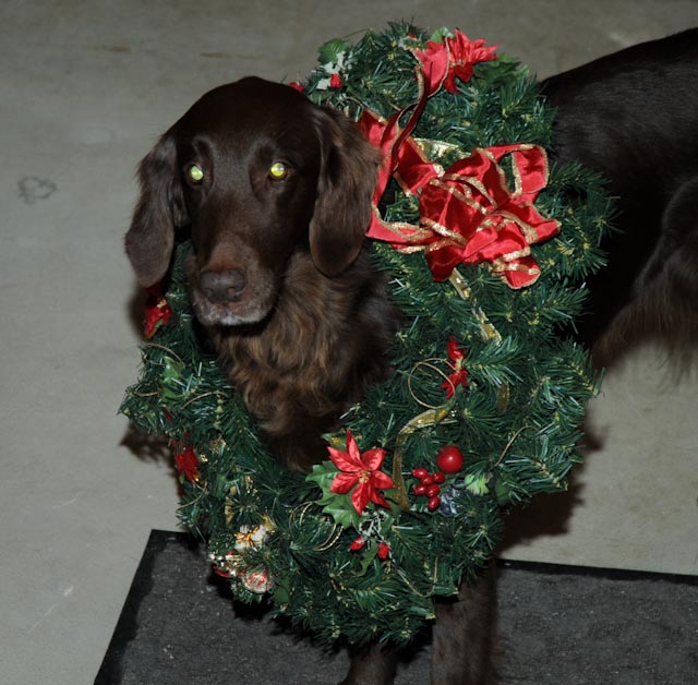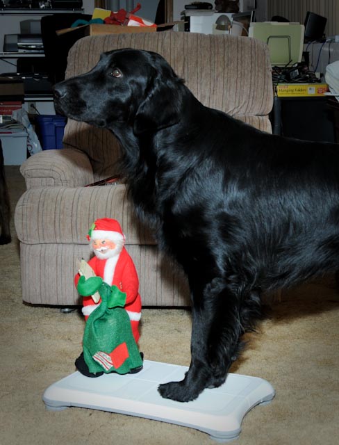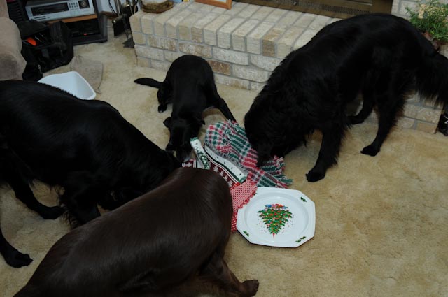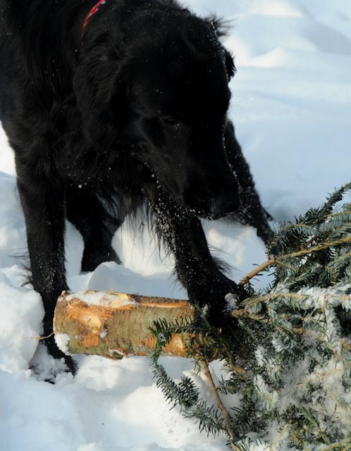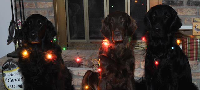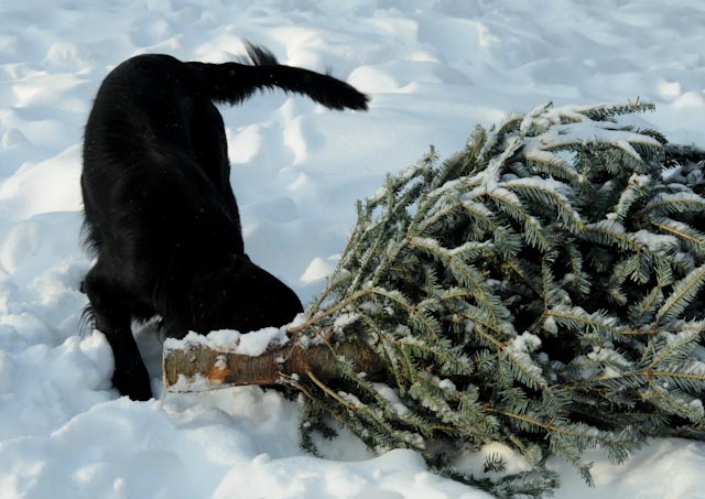 It’s been a busy December, and I waited until today to buy a tree. Not a good idea. The garden center where we usually buy our tree had about 8 Charlie Brown trees left. I purchased a tree there in previous years just a day or 2 days before Christmas and had a good number to choose from. The tenuous economy must have prompted them to limit the number of trees they cut, so that they don’t end up as wood chips the day after Christmas. But, good news, I found a nice Fraser fir at another local lot. As you can see, Onyx likes to help prepare the tree for bringing it into the house. We have been buying Fraser firs for our Christmas tree for years. The Frasier fir is a small evergreen coniferous tree. The crown is conical, with straight branches from horizontal to angled 40° upward from the trunk. The Fraser fir is widely used as a Christmas tree. Its fragrance, shape, strong limbs, and ability to retain its soft needles for a long time when cut make it one of the best trees for this purpose. The Fraser fir has been used more times as the Blue Room Christmas tree (the official White House Christmas tree of the President) than any other type of tree. Historically, evergreen trees represented eternal life and the promise of replenishment during the cold winter solstice. Apples and other fruit were hung upon the tree to represent the plentiful food to come. Candles were lighted to symbolize the warmth and brightness of the sun. This year should be much easier for me to trim the tree. Last year at this time I was still in my back brace, and bending over was difficult at best. Then again, perhaps there were few ornaments on the bottom of last year’s tree due to our 7 month old flat-coat. This year I hope for an even distribution of ornaments on the tree from top to bottom. Doggies, do you know where your tails are?!?!? |