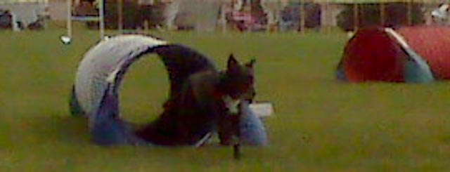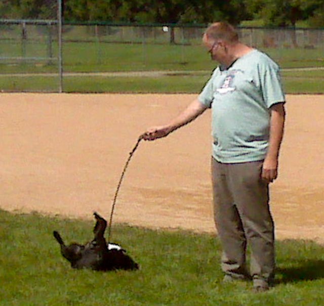 Kona warms up for his agility runs by rolling on his back in the grass! |